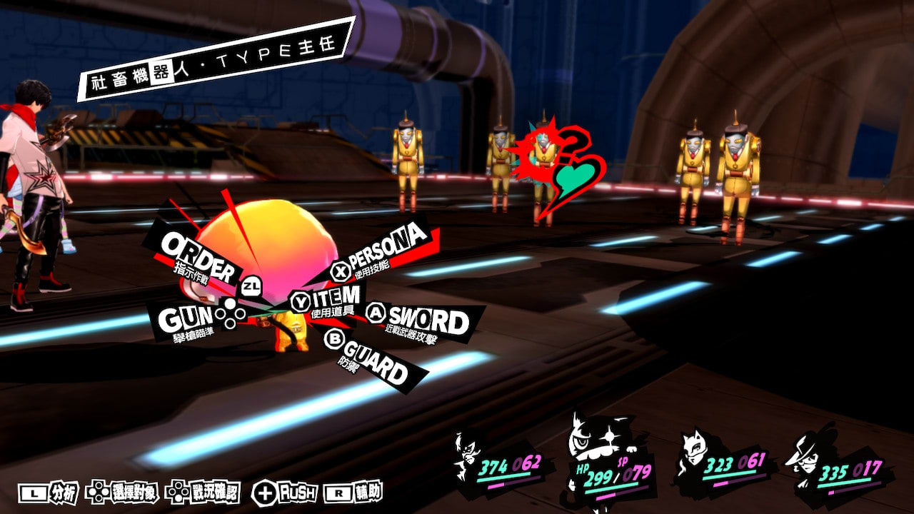 游戏在枯燥的 JRPG 战斗添加了一些不一样的地方,例如随着角色的羁绊游戏所获的辅助都不一样,例如昏厥状态下同伴会叫醒你。P5R 在战斗系统优化了不少回合制 JRPG 的特色但不限于: